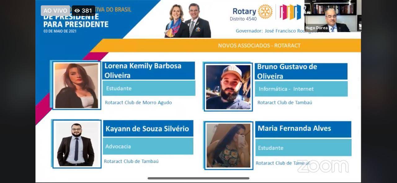 O Rotaract Club de Tambaú participou da Grande Posse Coletiva do Brasil, ocorrida no dia 03 de maio, de maneira virtual. Na oportunidade tomaram posse 03 novos companheiros: Bruno Gustavo Oliveira, Kayann de Souza Silvério e Maria Fernanda Alves. Dentre as autoridades rotárias presentes estava o Presidente de RI Holger Knaack.